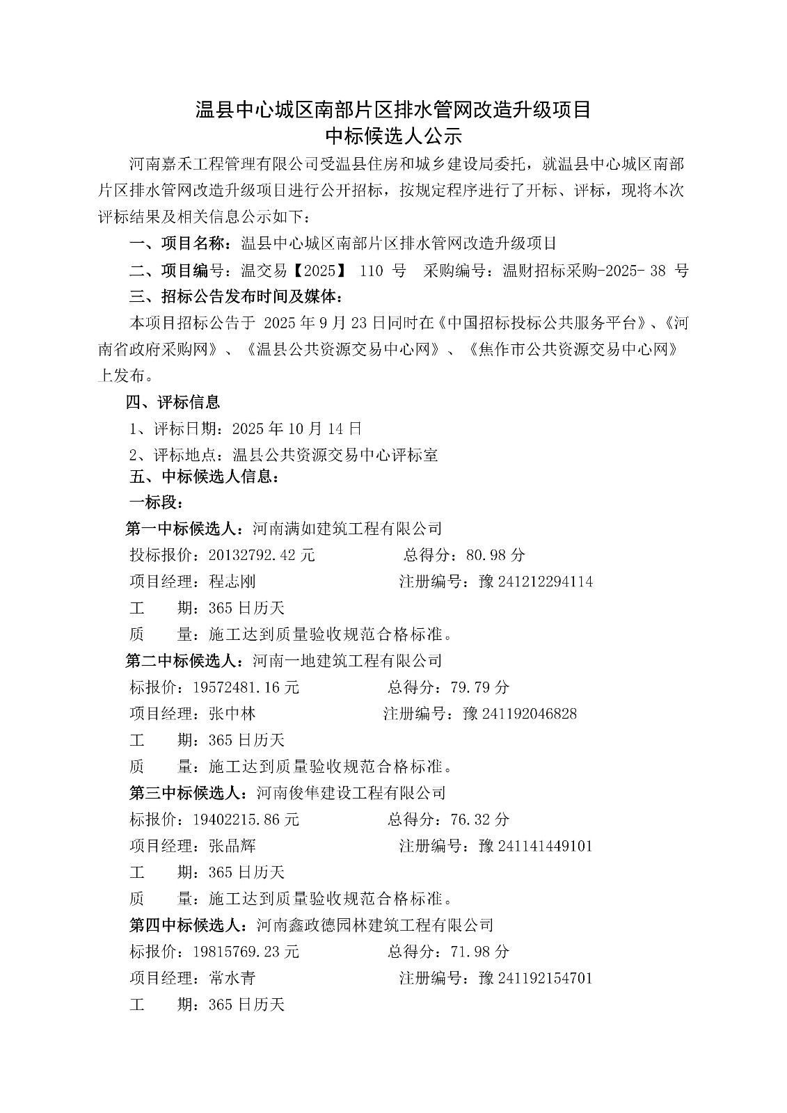 温县中心城区南部片区排水管网改造升级项目中标候选人公示